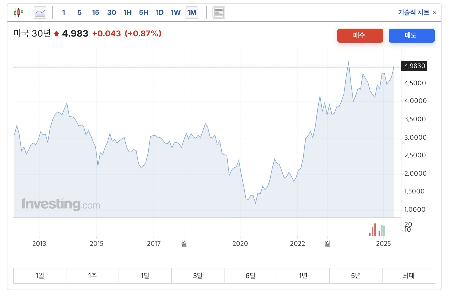 - 채권의 움직임은 주식처럼 그렇게 유동적이지 않고, 또 증권사에서 주식처럼 차트를 제공하지도 않는다. 그래서 investing.com과 같은 사이트를 통해서 10년물, 30년물 등의 수익률을 보고 매수/매도 시점을 결정할 수 밖에 없다.